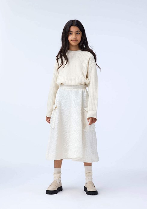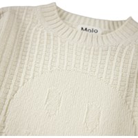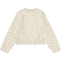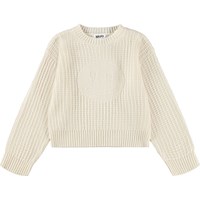 Gebreide crèmekleurige wollen trui. De trui is gebreid in een wafelpatroon met een grote glimlachend gezicht op de voorkant. De trui heeft ribboorden rond de hals, mouwen en taille.