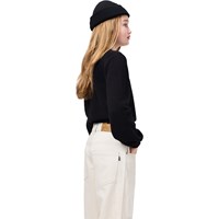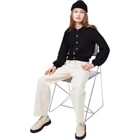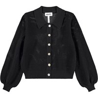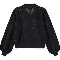 Zwarte gehaakte vest gemaakt van biologisch katoen. De vest heeft volumineuze mouwen met een decoratief opengewerkt patroon, een klassieke kraag en knopen aan de voorkant.