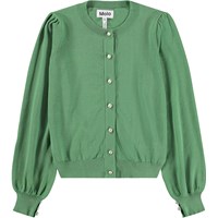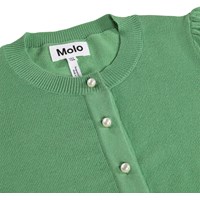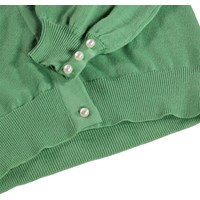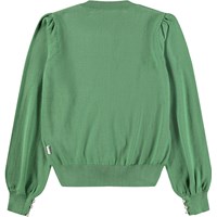 Exclusief gebreide groen vest van zacht biologisch katoenen. Het vest heeft volumineuze ballonmouwen en fijne parelmoer knopen langs de voorkant en bij de mouwen.