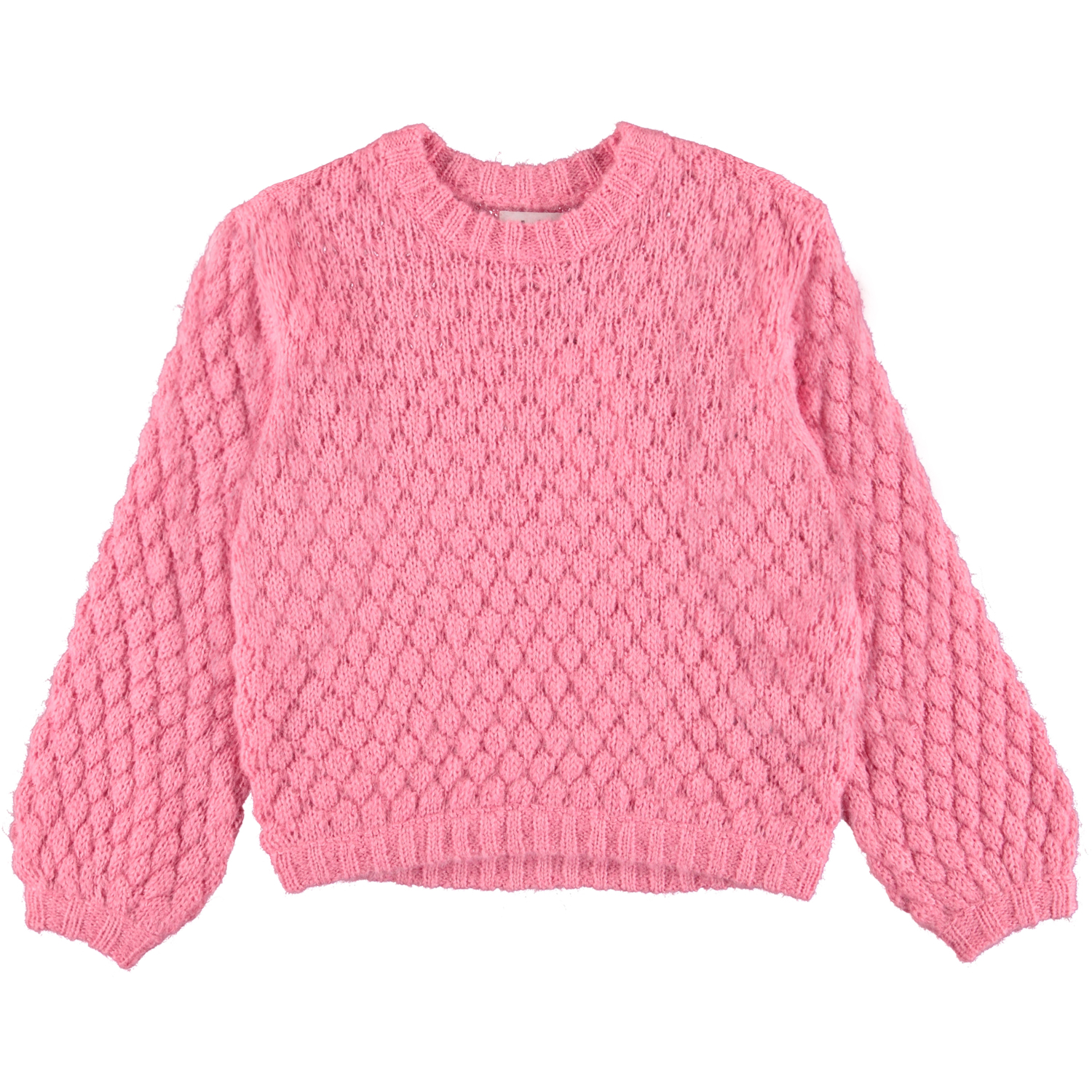 Gulia is een roze gebreide trui in een prachtig patroon. De mouwen zijn in een prachtige bell style.