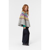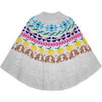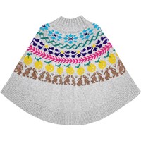 Grijze poncho van een mix van zachte wol en acryl met een ronde hals en gebreide geribbelde boorden rond de hals en zoom. De poncho heeft een Noors geïnspireerd patroon met konijnen, fruit en bloemen in prachtige kleuren die zich uitstrekken van de voorkant naar de achterkant.