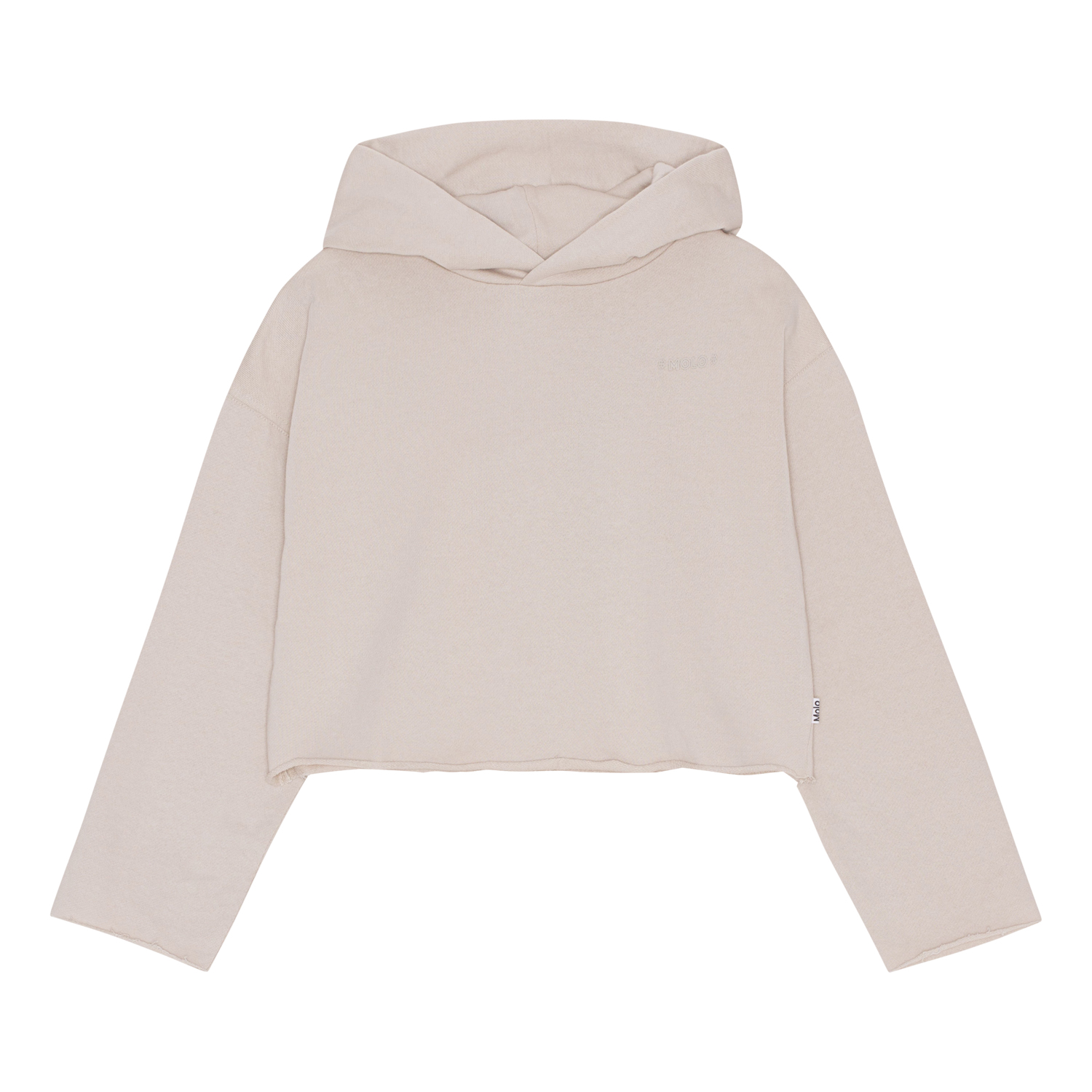Maddy is a beige sweatshirt in a cropped shape with a hood. Wear it with the matching sweatpants.