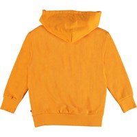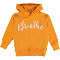 Oversized gele hoodie met tekst aan de voorkant en wijde ribboord aan de mouwen en onderkant.