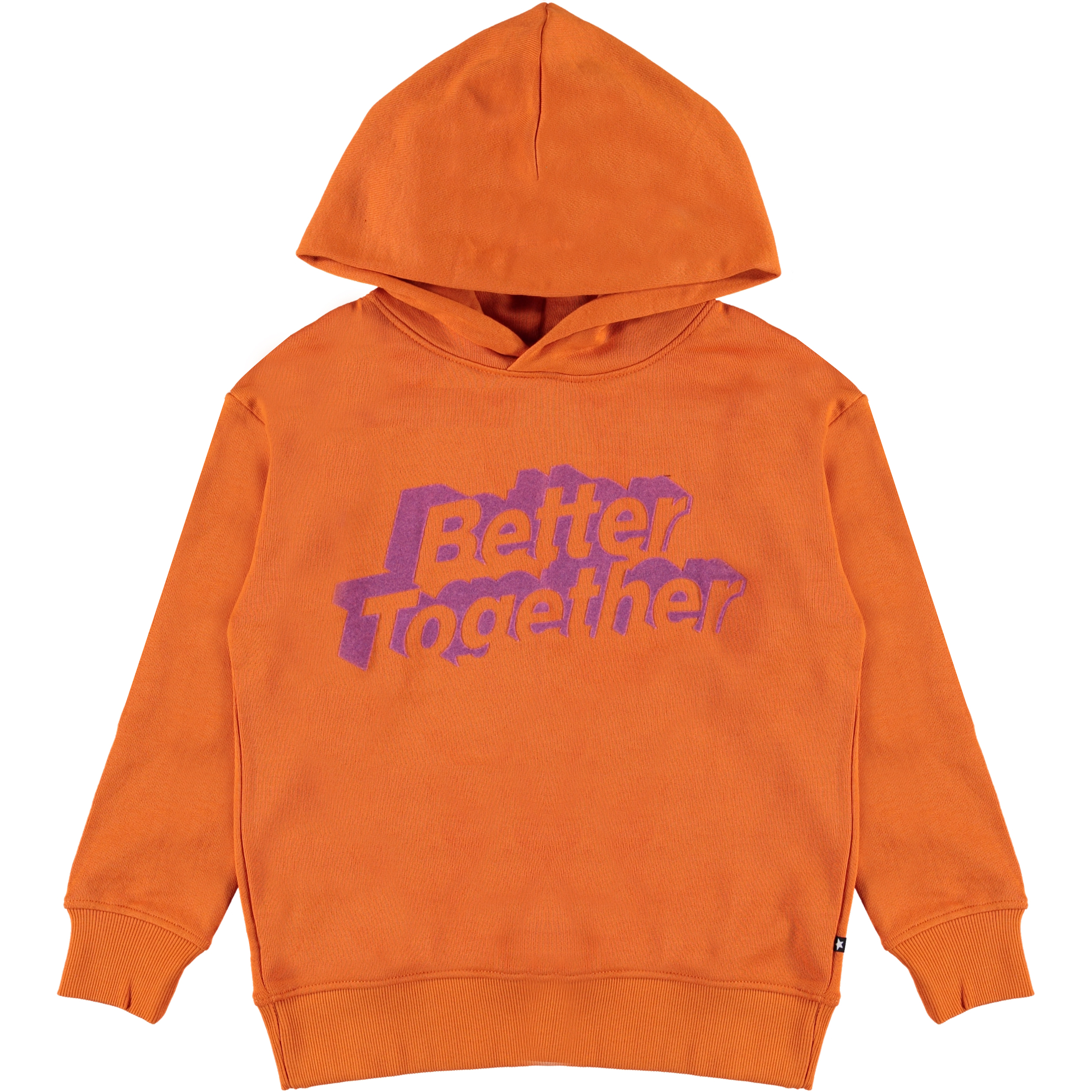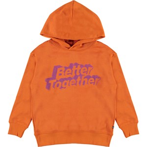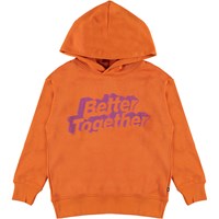 Madelyn is een oranje hoodie met in op de voorkant in het paars de tekst 'Better Together'.