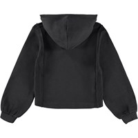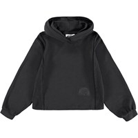 Zwarte hoodie gemaakt van biologisch katoen. De hoodie heeft mooie panelen aan de zijkanten en een kleine geborduurde zon en de tekst ''Molo''. De hoodie heeft een ruimvallende pasvorm en ribboorden rond de mouwen en de capuchon.