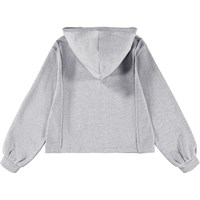 Grijze hoodie gemaakt van biologisch katoen. De hoodie heeft mooie panelen aan de zijkanten en een kleine geborduurde zon en de tekst ''Molo''. De hoodie heeft een ruimvallende pasvorm en ribboorden rond de mouwen en de capuchon.