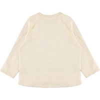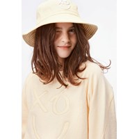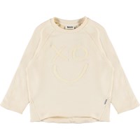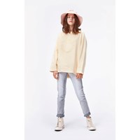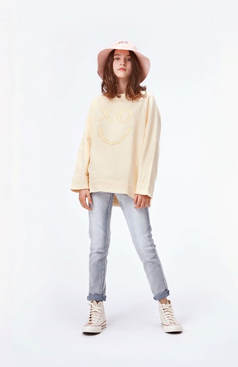 Maggie is een lang en ruimvallende sweater in lichtgeel met raglanmouwen. Het heeft een smiley op de voorkant.