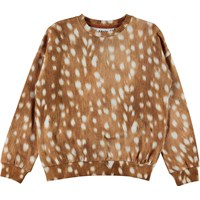 Maja is een bruine sweater met een print van witte vlekken die lijkt op de vacht van een hert. Draag de trui met een bijpassende broek.