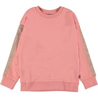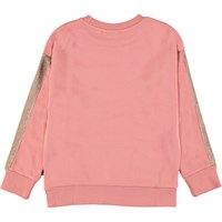 Manon is een roze trui met een goede lengte met glitterkleurige gouden band aan de zijkanten van de mouwen.