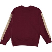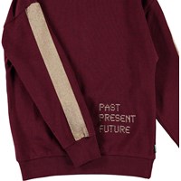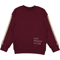 Manon is een donkerrode trui met gouden strepen langs de zijkanten van de mouwen. Het heeft de tekst 'Past, present, future' in goud onderaan. De trui heeft verlaagde schouders en ribboord rond de mouwen, hals en onderkant.
