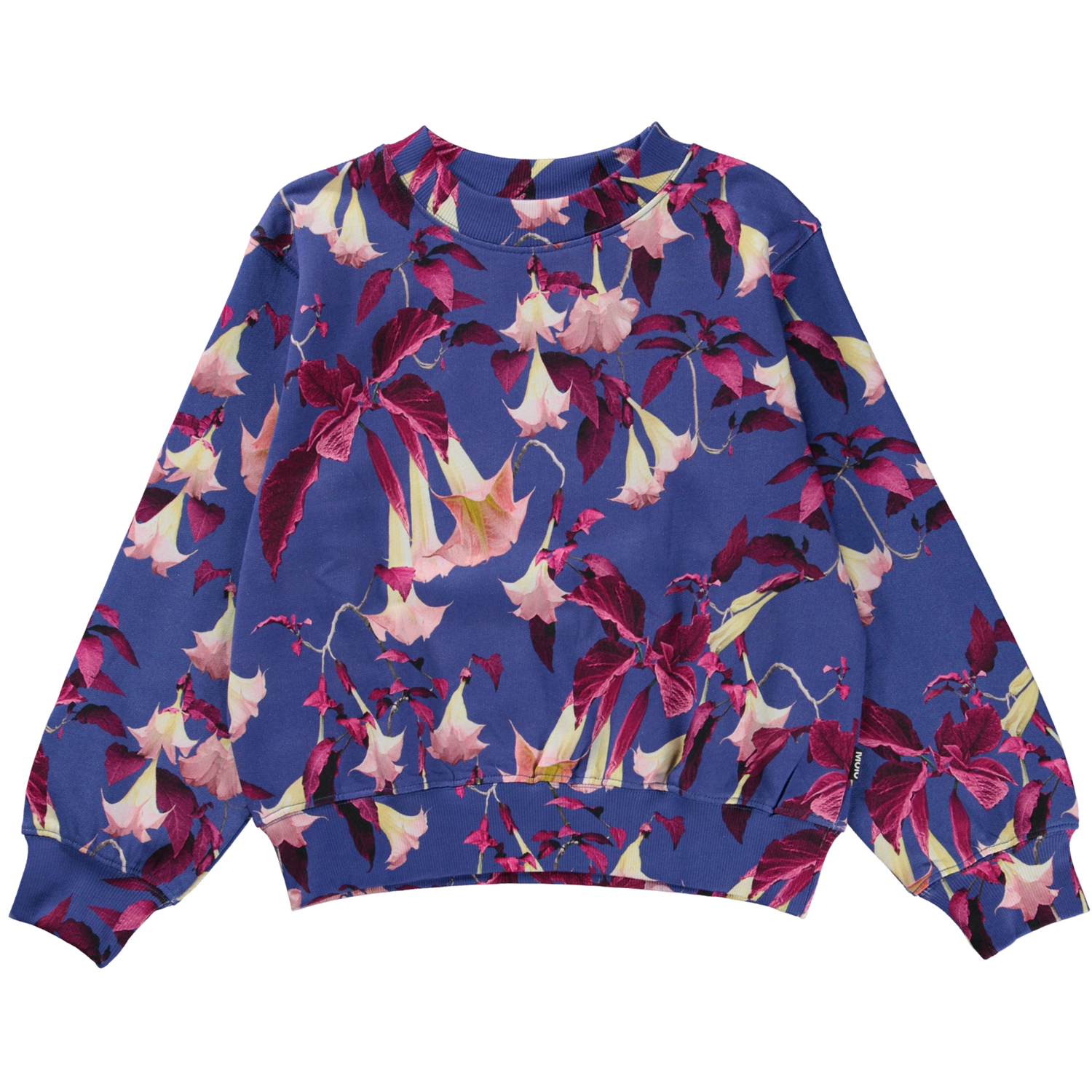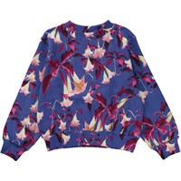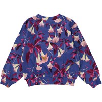 Donkerblauwe sweater met een bloemenprint. De print heeft een helderblauwe achtergrond en bestaat uit roze herfstbladeren en nachtbloeiende engeltrompetten, die 's nachts bloeit, niet overdag zoals bij andere bloemen. In deze print baden de bloemen in maanlicht als ze hun bloemblaadjes openen terwijl de rest van ons slaapt. Deze sweater is van 100% katoen, heeft een ronde hals met een ribboord, ribboord aan de mouwen en onderkant en het heeft een normale pasvorm. Voor een coole look draag je deze sweater met de bijpassende Adan joggingbroek of de Barbera rok die dezelfde print heeft.