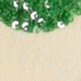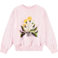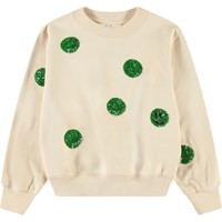 Beige sweater van zacht biologisch katoen met ribboord rond de hals, mouwen en onderkant. De sweater heeft een ruimvallende pasvorm met groene smiley's van pailletten.