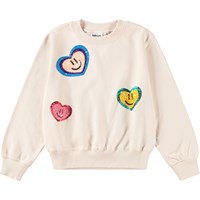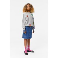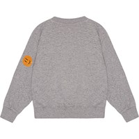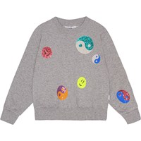 Grijze gemêleerde sweater van biologisch katoen met een ronde hals en geribbelde boorden rond de hals, zoom en mouwen. Ruime pasvorm. Veelkleurige ronde pailletten borduursels van Yin en Yang symbolen en smileys.
