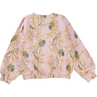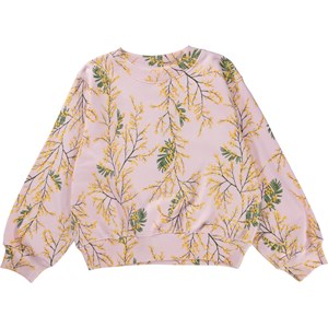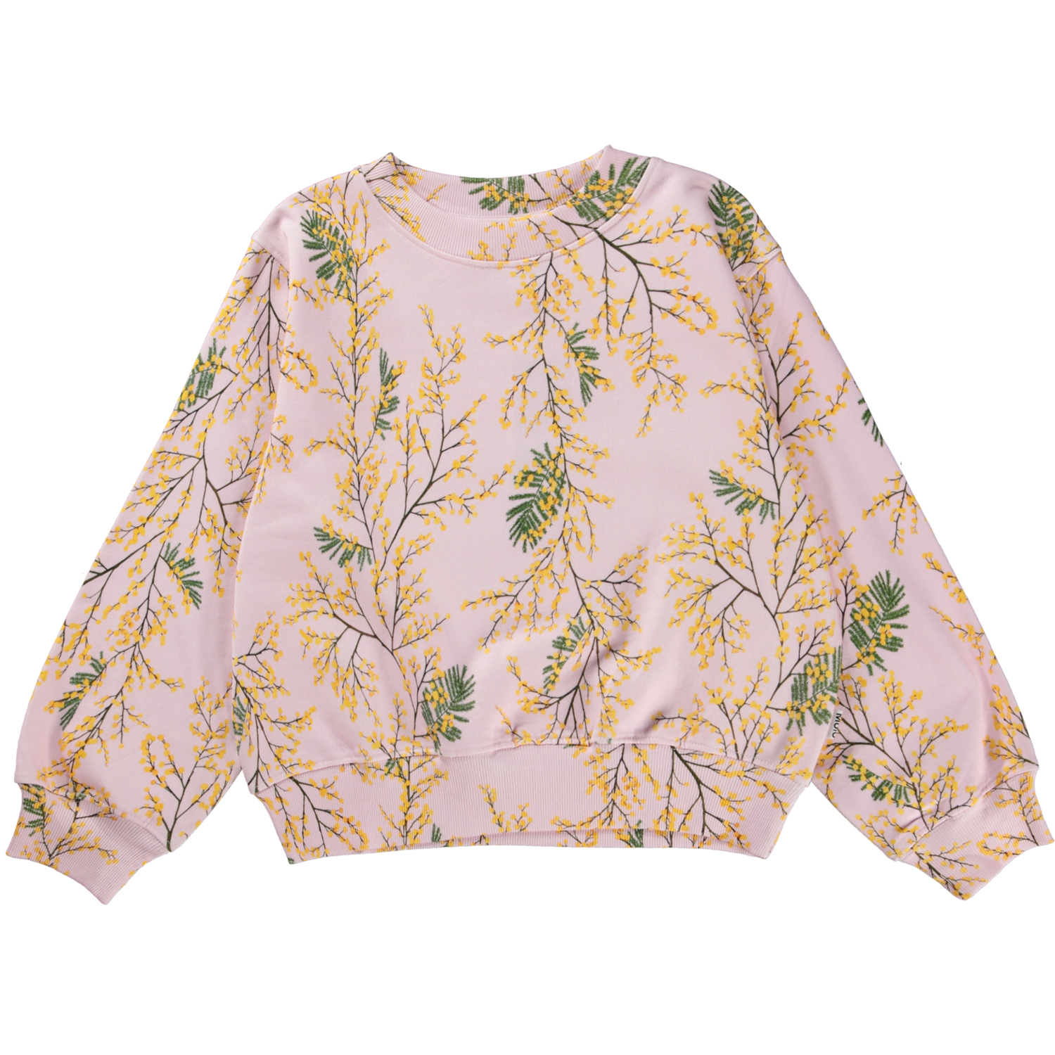Lichtpaarse sweater met een mimosa print. De print is van takken van gele mimosa bloemen. Deze sweater is van 100% katoen, heeft een ronde hals met ribboord, ribboord aan de mouwen en onderkant en het heeft een normale pasvorm. Voor een coole look draag je de sweater met de bijpassende Adan joggingbroek die dezelfde print heeft.