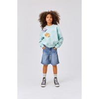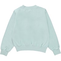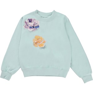 Marge is een lichtblauwe trui van 100% biologisch katoen. De trui heeft ribboord rond de hals, mouwen en onderkant. De trui heeft opgestikte bloemen emblemen in pailletten.