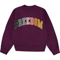 Paarse sweater met op de voorkant een borduurwerk. Op het borduurwerk staat schuine over de borst het woord "Freedom", in prachtige regenboogkleuren. Deze sweater is van 100% katoen, heeft een ronde hals met een ribboord, ribboord aan de mouwen en onderkant en het heeft een ruimvallende pasvorm.