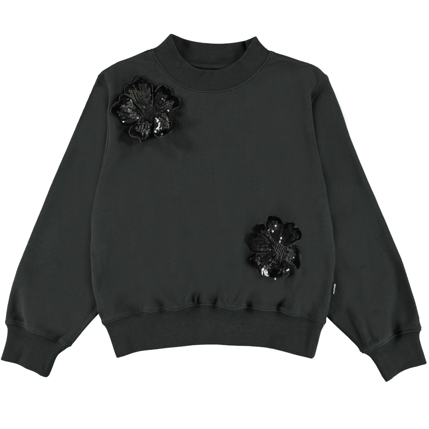 Marge is een hele donkergrijze sweater met op de voorkant een bloemenprint van pailletten. De sweater heeft een ribboord aan de hals, onderkant en mouwen. Draag de sweater met de bijpassende joggingbroek.