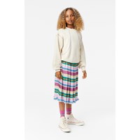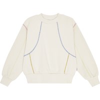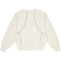 Off-white sweater van biologisch katoen met een ronde hals en geribbelde boord rond de hals, zoom en mouwen. De sweater heeft een oversized pasvorm en prachtige kleurrijke zichtbare overlocknaden, die zorgen voor een symmetrische uitstraling en de sweater uniek maken.
