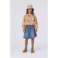 Roze sweater met een bloemenprint. De print is van verschillende bloemen zoals zonnebloemen en dahlia's in de kleuren roze en geel. Deze sweater is van 100% katoen, heeft een ronde hals met een ribboord, ribboord aan de mouwen en onderkant en het heeft een ruimvallende pasvorm. Voor een schattige look draag je de sweater met de bijpassende Barbera rok die dezelfde print heeft.
