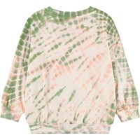 Groene en roze sweater gemaakt van biologisch katoen met een ronde hals en ribboorden rond de mouwen, hals en onderkant. De sweater heeft een zeer ruimvallende en relaxte pasvorm met een uniek tie-dye patroon.