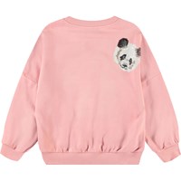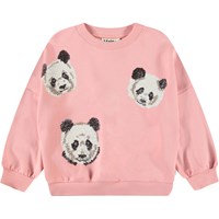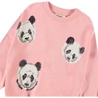 Roze sweater van zacht bioloigsch katoen met ribboord rond de hals, mouwen en onderkant. De sweater heeft een ruimvallende pasvorm en geborduurde pailletten in de vorm van kleine koppen van panda's