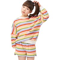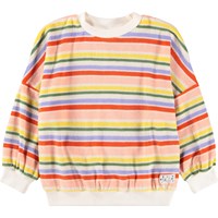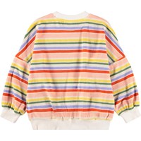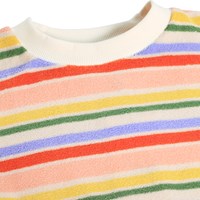 Sweater in meerdere kleuren gemaakt van zachte, biologische katoenen badstof met een ronde hals en ribboorden rond de mouwen, hals en onderkant. De sweater heeft een zeer ruimvallende en relaxte pasvorm met horizontale strepen en een klein logo aan de onderkant met de tekst 'Better together'.