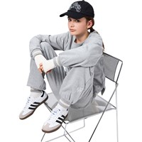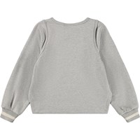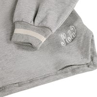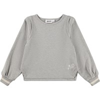 Grijze sweater gemaakt van zachte, biologische katoen met een ronde hals en gestreepte ribboorden rond de mouwen. De sweater heeft een ruimvallende en relaxte pasvorm met kleine zijsplitten en een wit geborduurd logo met de tekst 'Molo'.
