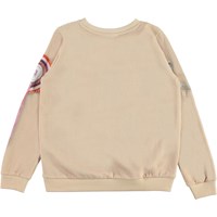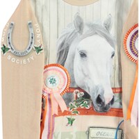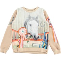 Marlee is een roze sweater met een print van een paard op de voorkant en een rozet en hoefijzer op de mouwen.