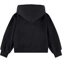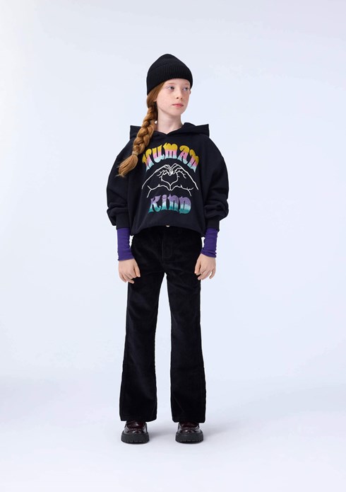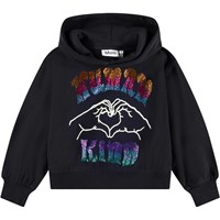 Zwarte hoodie gemaakt van biologisch katoen. De hoodie heeft een veelkleurig motief met pailletten en de tekst ''Humankind'' en handen die een hart vormen. De hoodie heeft een ruimvallende pasvorm en ribboorden.