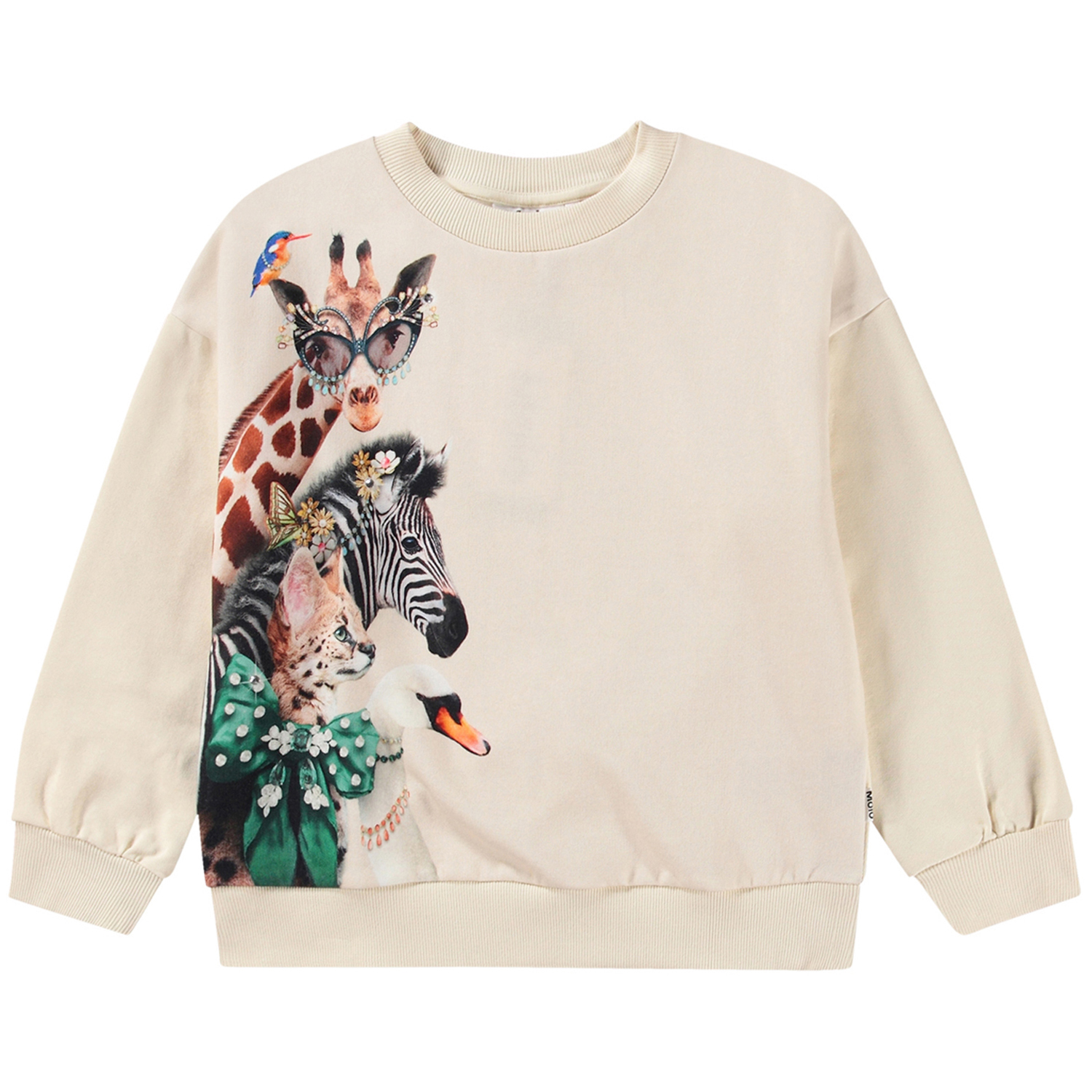 Off-white sweater van biologisch katoen met een gevoerde binnenkant, waardoor het zacht en warm is om te dragen. De sweater heeft een ruime pasvorm, een ronde hals, geribbelde boorden en een print op de voorkant van verschillende dieren, allemaal mooi aangekleed en klaar om te feesten.