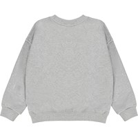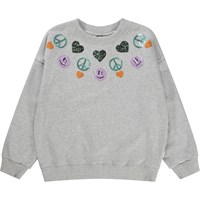 Lichtgrijze gemêleerde sweater met aan de voorkant geborduurde pailletten. De geborduurde pailletten zit tot op de schouder en creëeren een soort kraag met hartjes, peace tekens en smiley’s. Deze sweater is van 100% katoen, heeft een ronde hals met een ribboord, ribboord aan de mouwen en onderkant en het heeft een ruimvallende pasvorm.