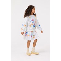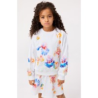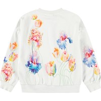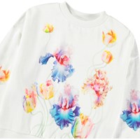 Witte sweater van zacht bioloigsch katoen met ribboord rond de hals, mouwen en onderkant. De sweater heeft een ruimvallende pasvorm met een kleurrijke print van artistieke tulpen.