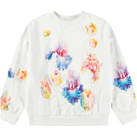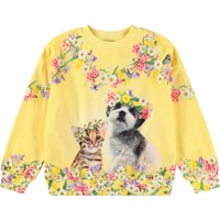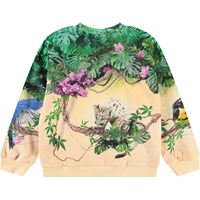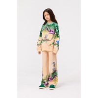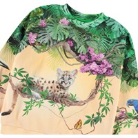 Lichtoranje sweater van zacht bioloigsch katoen met ribboord rond de hals, mouwen en onderkant. De sweater heeft een ruimvallende pasvorm met een kleurrijke print van de weelderige jungle met paarse bloemen, poemawelpen, vlinders en papegaaien tussen de takken. Voor een complete set combineer je het met de bijpassende broek.