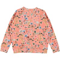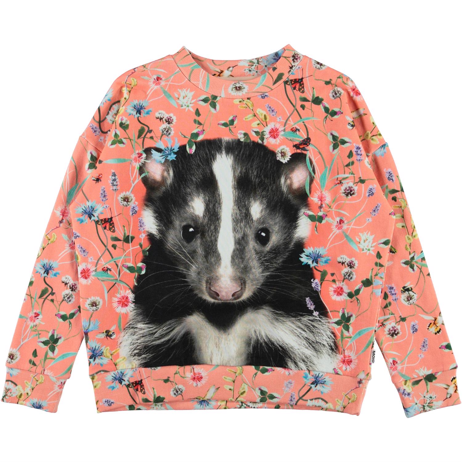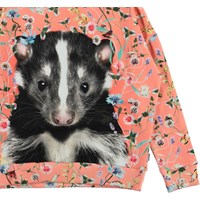 Maxi is een koraalkleurige sweater met een print van wilde bloemen en een stinkdier. Het heeft een oversized pasvorm.