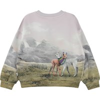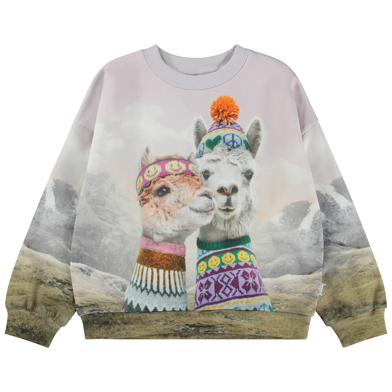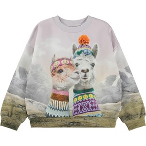 Paars en groene sweater met een lama print. De humoristische print toont twee lama's die Molo's eigen breiwerk dragen, en ze dragen allebei mutsen, infinity sjaals en truien. Deze sweater is van 100% katoen, heeft een ronde hals met een ribboord, ribboord aan de mouwen en onderkant en het heeft een ruimvallende pasvorm.