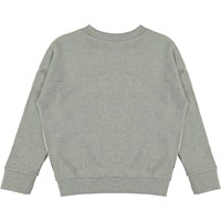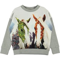 Maxi is een grijze trui met een print op de voorkant van paarden versierd met bloemen. Het heeft een ribboord rond de hals, mouwen en onderkant.