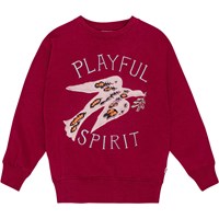 Organisch katoenen sweater in bordeauxrood. Ronde hals met geribbelde boord en geribbelde boord rond de taille en mouwen. Normale pasvorm met borduursel op de voorkant van een artistieke vogel en de tekst "Playful Spirit". Gevoerde binnenkant voor extra zachtheid en warmte.