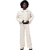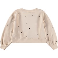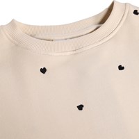 Beige sweater gemaakt van zacht, biologisch katoen met een ronde hals en ribboorden rond de hals, mouwen en onderkant. De sweater heeft een zeer ruimvallende pasvorm, is op heuplengte en heeft geborduurde kleine zwarte hartjes.