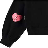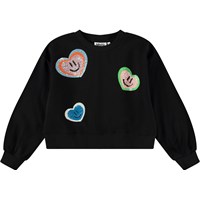 Zwarte sweater van zacht biologisch katoen met ribboord rond de hals, mouwen en onderkant. De sweater is oversized en heeft kleurijke geborduurde pailletten in de vorm van lachende hartjes.