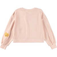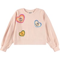 Roze sweatser gemaakt van zacht, biologisch katoen met een ronde hals en ribboorden rond de hals, mouwen en onderkant. De sweater heeft een zeer ruimvallende pasvorm, is op heuplengte met kleurrijke geborduurde hartjes van pailletten.