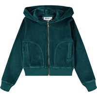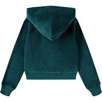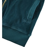 Groene vest gemaakt van zacht velours. De vest heeft een normale pasvorm, een rits, een capuchon, ribboorden en zijzakken. Je kunt de vest combineren met de bijpassende broek om een complete en comfortabele velours set te creëren.