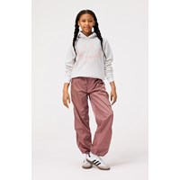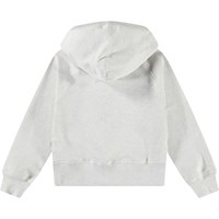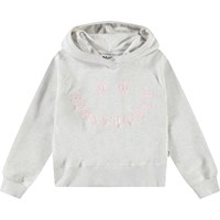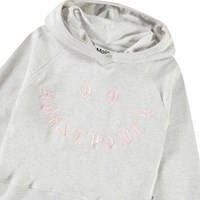 Lichtgrijze hoodie van zacht biologisch katoen met ribboord rond de capuchon, mouwen en onderkant. De hoodie heeft een ruimvallende pasvorm met op de voorkant een lichtroze geborduurde smiley met de tekst 'Horsepower' als mond.