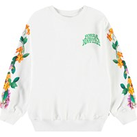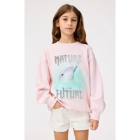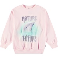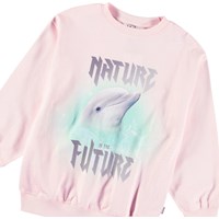 Roze sweater van zacht biologisch katoen met ribboord rond de hals, mouwenen onderkant. De sweater heeft een ruimvallende pasvorm met op de voorkant een print van een dolfijn en de tekst 'Nature Future'.