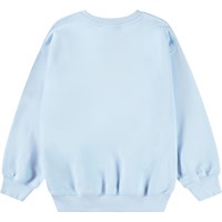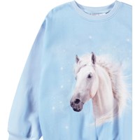 Lichtblauwe sweater van zacht biologisch katoen met ribboord rond de hals, mouwen en onderkant. De sweater heeft een ruimvallende pasvorm met op de voorkant een print van een wit paard omgeven met sterren.