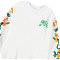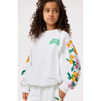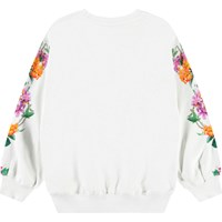 Witte sweater van zacht biologisch katoen met ribboord rond de hals, mouwenen onderkant. De sweater heeft een ruimvallende pasvorm met een print van oranje en roze bloemen op de mouwen en de tekst 'Forza Della Natura' op de borst. Voor een complete set combineer je het met de bijpassende broek.