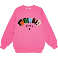 Op de sweater staat een geborduurde afbeelding met de tekst 'World Play' in meerdere kleuren. De boodschap achter "World Play" gaat over hoe spelen niet alleen leuk is, maar ook een betekenisvolle manier is om te leren en te ontwikkelen. Spelen versterkt onze sociale vaardigheden, empathie en hersenfunctie, en brengt een gevoel van geluk, ongeacht leeftijd.