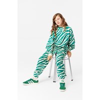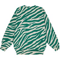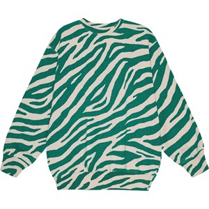 Groen en gebroken wit zebra-gestreepte sweater van biologisch katoen met een gevoerde binnenkant, waardoor het zacht en warm is om te dragen. De sweater heeft een ruime pasvorm, een ronde hals en geribbelde boorden rond de mouwen, hals en onderkant. De sweater kan gecombineerd worden met de bijpassende broek voor een complete set.