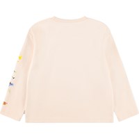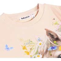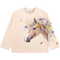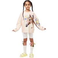 Roze sweater met een ronde hals en ribboord. De sweater heeft een ruimvallende en relaxte pasvorm met een print van kleurrijke zomerbloemen, vlinders en een prachtig paard.