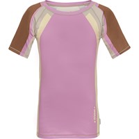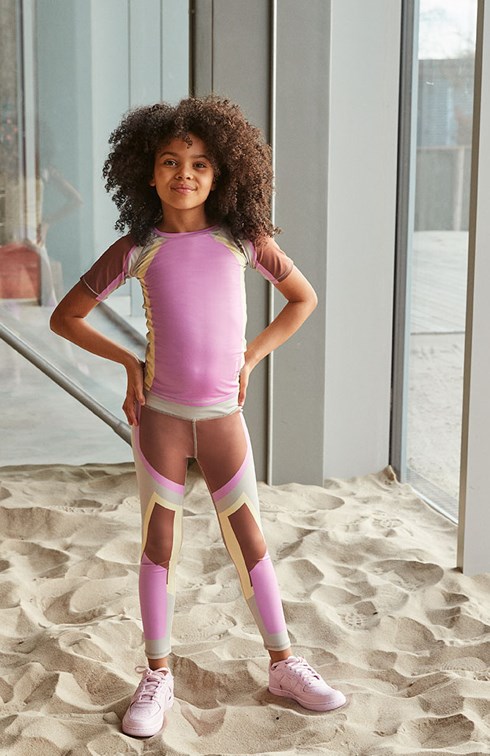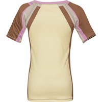 Oaklynn is a rose coloured sports t-shirt in block colours. It has brown sleeves, light yellow and beige details and a light yellow back. The t-shirt is part of Molo's sports collection, which helps integrate sports and fashion. The top is comfortable and constructed in technical materials that make it wearable for down time as well as intense activity. Molo’s sports collection is created with a unique, high performance technology called HeiQ Smart Temp, which supports the body's own ability to cool down. The cool down function is activated when the body gets warm and sweaty. It is deactivated when the body has cooled down. HeiQ Smart Temp ensures optimal comfort and performance. It has been independently tested to ensure that it is safe for the skin.