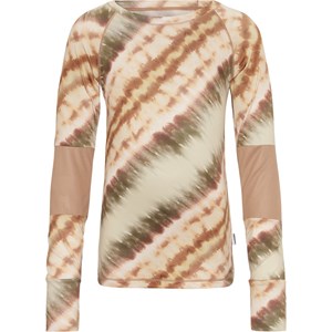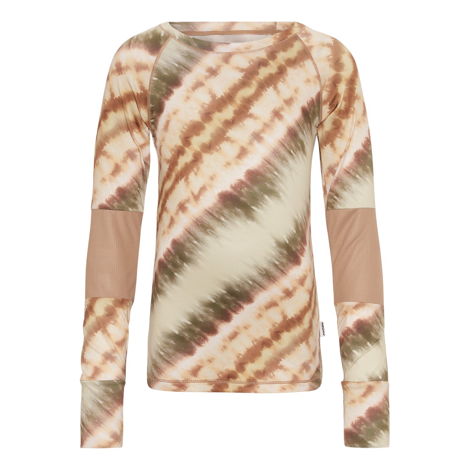 Odelia is een sportshirt met lange mouwen in een groene en beige tie-dye print. Odelia is een onderdeel van Molo’s sportcollectie, die sport en mode integreert. Het shirt is comfortabel en gemaakt van technische materialen, waardoor het zowel voor vrije tijd als voor intensieve activiteiten gedragen kan worden. Molo’s sportcollectie is gemaakt met een unieke en hoogwaardige technologie genaamd HeiQ Smart Temp, die het lichaam ondersteunt om af the koelen. De afkoelfunctie wordt geactiveerd wanneer het lichaam warm en zweterig is. Het wordt gedeactiveerd wanneer het lichaam is afgekoeld. HeiQ Smart Temp zorgt voor optimaal comfort en prestaties. Het is onafhankelijk getest om er zeker van te zijn dat het veilig is voor de huid.